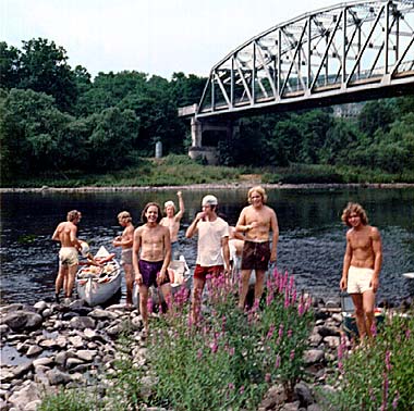 Launch site: waiting for the rest of the Crew to arrive That's Bogie, Wiz and Lance leaning on Bogie's Duster. We meet at Smiley's house, the guy who rents the canoes (he was always smiling), then ride in his van (behind Bogie's Duster) to put in the river. Our starting/ending points have been forgotten, though possibly we started at Port Jervis and ended at Smith- field Beach. Also our longest trip, 4 days/3 nights (see map pg.) |